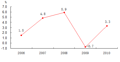 初步核算,2010全年中国国内生产总值[2]397983亿元,比上年增长10.3%。其中,第一产业增加值40497亿元,增长4.3%;第二产业增加值186481亿元,增长12.2%;第三产业增加值171005亿元,增长9.5%。第一产业增加值占国内生产总值的比重为10.2%,第二产业增加值比重为46.8%,第三产业增加值比重为43.0%。