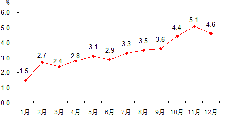 居民消费价格一季度同比上涨2.2%,二季度上涨2.9%,三季度上涨3.5%,四季度上涨4.7%,全年平均比上年上涨3.3%,其中食品价格上涨7.2%。固定资产投资价格上涨3.6%。工业品出厂价格上涨5.5%。原材料、燃料、动力购进价格上涨9.6%。农产品生产价格上涨10.9%。