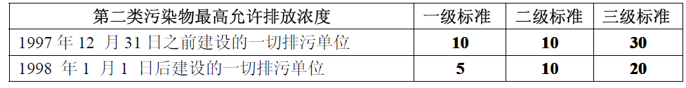 最高允许排放浓度:(单位mg/L)