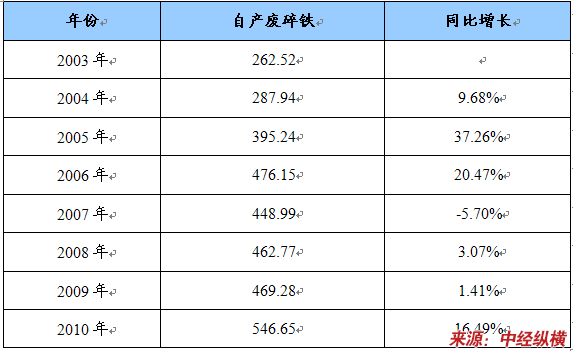2003-2010年企业自产废碎铁产量统计 单位:万吨