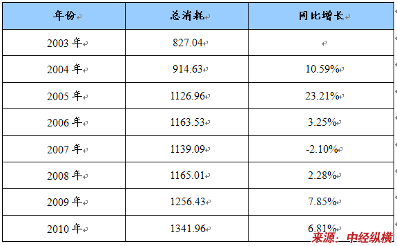 2003-2010年废碎铁消耗量统计 单位:万吨