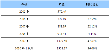 2005-2009年下游 行业 (汽车)产量增长情况统计表