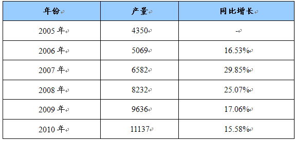 2005-2010年抢险救援车产量及同比增长统计表 单位:辆