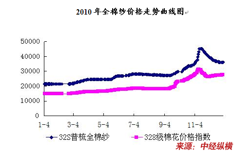 棉纱价格是影响成本的主要因素,2010年的全棉纱市场只能用“百年一遇”来形容,有过暴涨的疯狂和迷惘,也经历过痛苦的下跌回忆。不过,随着全棉纱科技含量的提高,各种涡流纺、紧密纺、如意纺的兴起也带动了一批先进的纺织企业。同时,经过了2008年的金融风暴后,全棉纱市场也迅速的“茁壮成长”,在外单去库存化的影响下, 行业 景气度不断回升,市场出货持续火爆。不过,棉花缺口和人民币升值也持续影响着全棉纱的市场走势。
