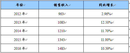 2012-2016年中国船用燃料油销售收入预测表 单位:亿元