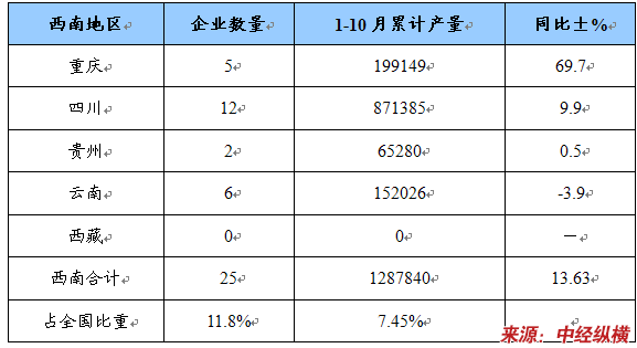 截止到2010年10月,西南地区具有规模以上烧碱生产企业25家,占全国11.8%;1-10月累计生产烧碱1287840吨,占全国产量的7.45%。