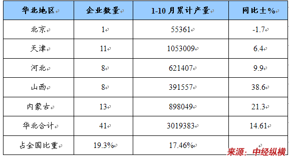 截止到2010年10月,华北地区具有规模以上烧碱生产企业41家,占全国19.3%;1-10月累计生产烧碱3019383吨,占全国产量的17.46%。