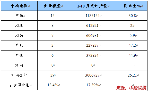 截止到2010年10月,中南地区具有规模以上烧碱生产企业39家,占全国18.4%;1-10月累计生产烧碱3006727吨,占全国产量的17.39%。