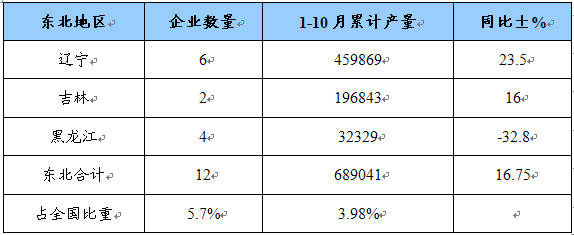 截止到2010年10月,东北地区具有规模以上烧碱生产企业12家,占全国5.7%;1-10月累计生产烧碱689041吨,占全国产量的3.98%。
