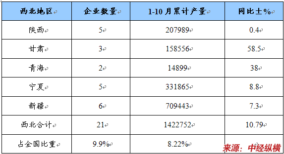 截止到2010年10月,西北地区具有规模以上烧碱生产企业21家,占全国9.9%;1-10月累计生产烧碱1422752吨,占全国产量的8.22%。