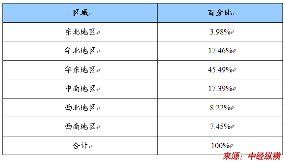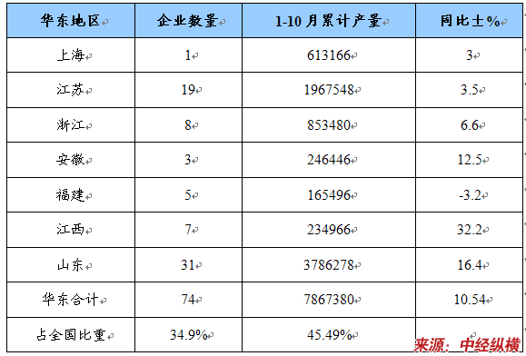 截止到2010年10月,华东地区具有规模以上烧碱生产企业74家,占全国34.9%;1-10月累计生产烧碱7867380吨,占全国产量的45.49%。