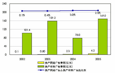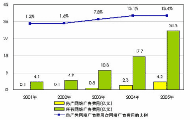 随着房产网络广告的投放费用增长,房产网络广告占所有网络广告的比例也在近年来保持较高的增长姿态,尤其在2005年,房产网络广告的投放费用已经占到了中国网络广告投放费用的13.4%。
