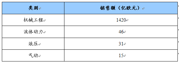 德国流体动力同业销售额为38亿欧元,其中液压为25亿欧元,气动13亿欧元,销售额为41亿欧元,其中液压约占65%;从业人员28000名。从属于密封 行业 协会的销售额为83.3亿欧元。德国流体动力协会(VDMA)会员公司171个,其中液压80个、气动27个,同时从事液压气动产品的厂家为64个。