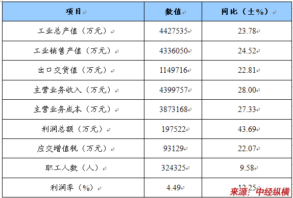 2.协会统计的200家企业,今年1~3月累计完成工业总产值187.14亿元,同比增长18.67%;主营业务收入188.31亿元,同比增长20.67%;出口交货值47.37亿元,同比增长7.93%;利润总额9亿元,同比增长34.64%;利润率4.78%,同比增长11.68%。