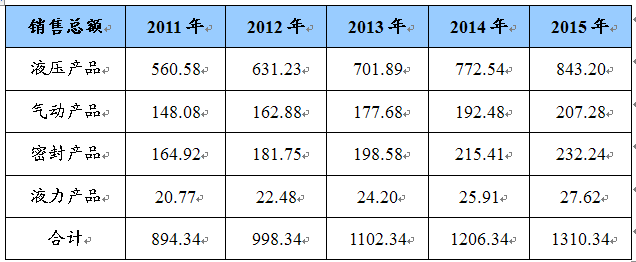 2011--2015年国内液压气动密封产品销售额预测 单位:亿元
