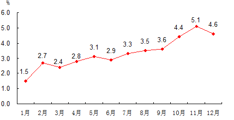 居民消费价格一季度同比上涨2.2%,二季度上涨2.9%,三季度上涨3.5%,四季度上涨4.7%,全年平均比上年上涨3.3%,其中食品价格上涨7.2%。固定资产投资价格上涨3.6%。工业品出厂价格上涨5.5%。原材料、燃料、动力购进价格上涨9.6%。农产品生产价格上涨10.9%。