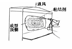 成型硬顶的粘接是在施工现场工人手持喷枪,直接将粘接胶均匀地喷涂在硬顶背面的粘接区域内,根据工艺要求晾置一段时间内,再粘贴在金属顶盖上(见图)。