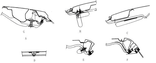 前周边与车体安装;D 硬顶中部与车体安装(用卡扣安装在顶盖横梁上);E 硬顶中部与车体安装(把手安装点);F 硬顶侧周边与车体安装;G 硬顶后周边与车体安装;成型硬顶的加工方法与使用性能主要取决于其材料性质。以往多数采用高压聚乙烯发泡材料制造。高压聚乙烯发泡材料具有无毒、质量轻、耐冲击、机械性能好、柔软性好等特点,但其成型性能差。目前,汽车顶棚采用多层材料复合成型的整体硬顶,由基材+缓冲隔热层+表皮层叠一体成型。基材可采用PU 发泡片材、PP 发泡片材、瓦楞纸、浸渍树脂的再生棉或玻璃纤维等,缓冲隔热层采用硬质聚氨酯泡沫塑料板,表皮材料主要采用织物、TPO 或PVC 膜。