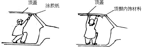 软顶的粘接有滚涂法和预涂法两种。用于滚涂法的粘接剂是氯丁橡胶,在施工现场工人手持蘸满胶的胶滚或胶刷,将胶均匀涂在顶盖的内表面上,晾置几分钟后,将软顶粘贴在指定位置上(见图)。 用于预涂法的压敏粘接剂是在生产软顶时,预涂在软顶的背衬上,用隔离纸将胶膜覆盖,以便包装和运输。在施工现场工人揭去隔离纸即可将软顶粘贴在指定位置上。哈飞6373 车软顶是采用滚涂法粘接的,哈飞6330E 车软顶是采用预涂法粘接的。其优点是操作简单,成本低。