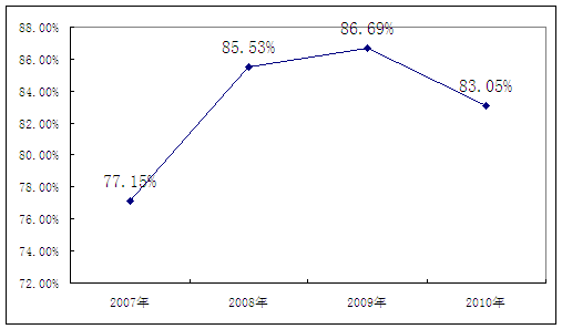 近年来,我国生长抑素虽然价格出现小幅下降,但其毛利率水平却保持较高水平,甚至出现上涨,以以翰宇药业2007-2010年毛利率水平为例,近四年毛利率变动如下: