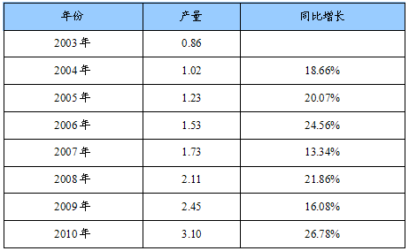2003-2010年中国塑料网片产量及其增长
