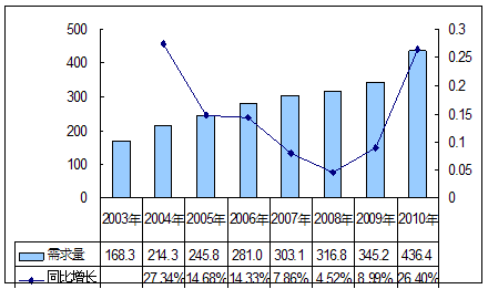 我国锌锭需求在下游产业建筑、交通、工业机械等 行业 的强劲需求下,需求量保持稳定增长,2010年增速达26.4%。