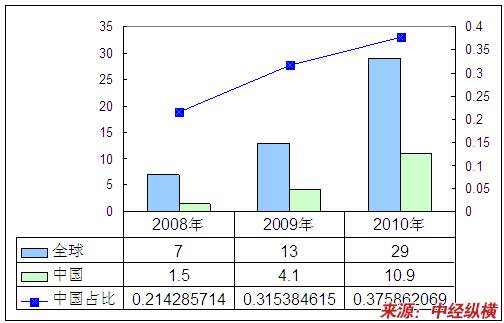 2008-2010年中国LED荧光粉销量占全球比例变化