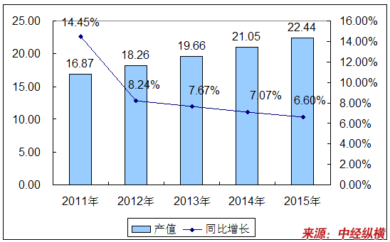 2011-2015年中国体育场馆座椅产值预测图 单位:亿元