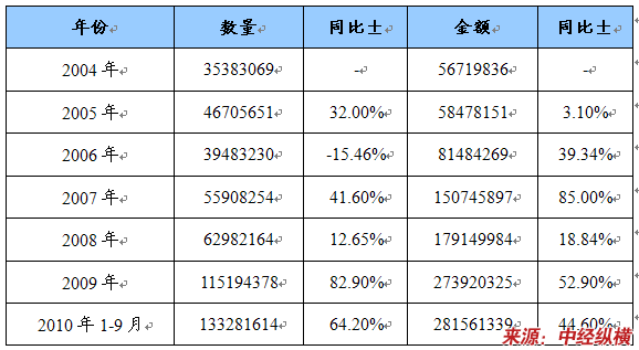 2003-2010年装压缩气体或液化气体的非零售包装钢铁容器出口量值统计 单位:千克;美元