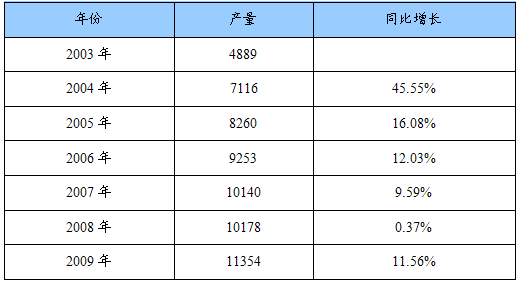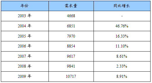 2003-2009年等离子焊接机需求量及同比增长统计表