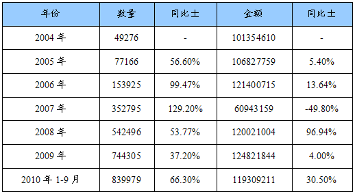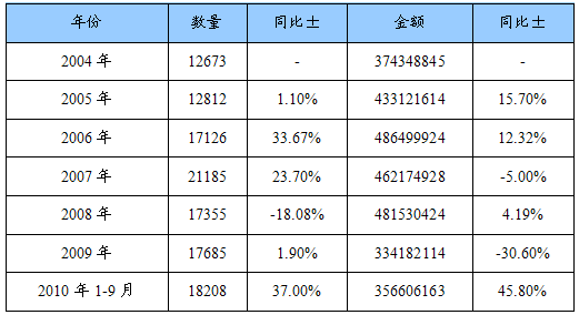 2004-2010年其他焊机;热喷金属或硬质合金的电气机器进口量值及增长统计表