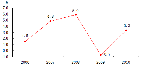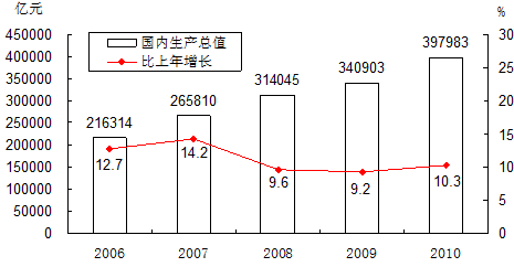初步核算,2010全年中国国内生产总值397983亿元,比上年增长10.3%。其中,第一产业增加值40497亿元,增长4.3%;第二产业增加值186481亿元,增长12.2%;第三产业增加值171005亿元,增长9.5%。第一产业增加值占国内生产总值的比重为10.2%,第二产业增加值比重为46.8%,第三产业增加值比重为43.0%。