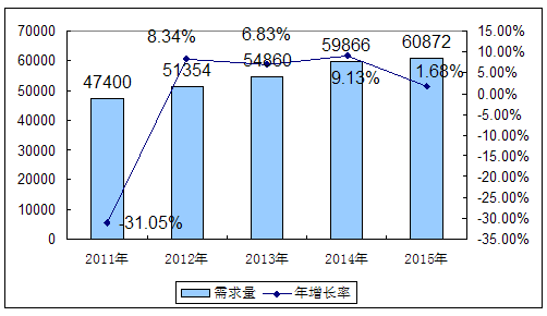 2011-2015年中国烧结钕铁硼磁铁需求量预测图 单位:吨