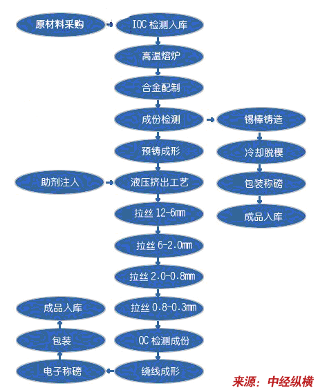 锡条的制备工艺较简单,主要包括配料、熔炼和浇铸两道工序,并严格控制氧化程度及金属、非金属杂质含量。其中熔炼温度和浇铸温度两个参数对锡条质量影响较大。锡条制备简单,技术门槛低,因而竞争异常激烈,目前定价仅在原材料成本上加上微薄的加工费,一旦原材料锡的价格短期内大幅波动,就可能将那一点点微薄利润一扫而空,甚至亏损。