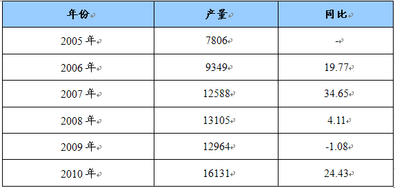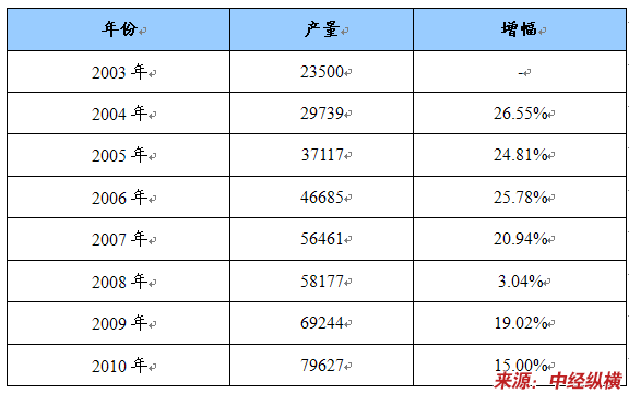 2003年-2010年钢材产量及增幅统计表 单位:万吨
