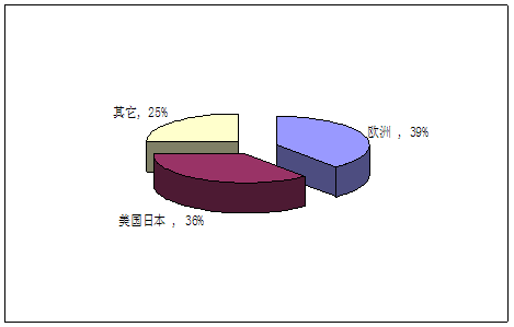 欧洲、美国和日本是最大的市场,占世界市场总额的75%。据统计,其中欧洲占39%;美国日本占36%;其它地区占25%,二其他地区的市场增长主要表现在亚洲,南美,中东市场的增长。