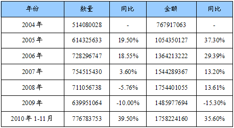 2004-2010年我国HS:95069110(健身及康复器械)出口量值统计