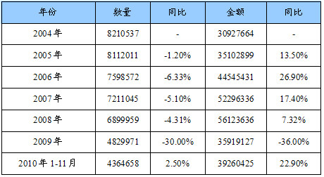 2004-2010年我国HS:95069110(健身及康复器械)进口量值统计