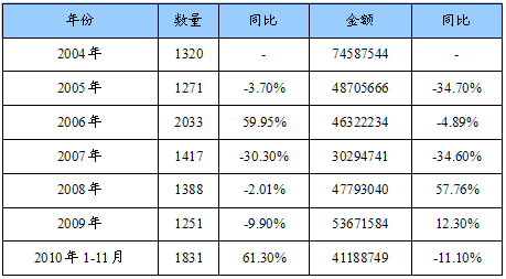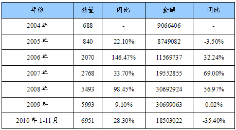 2004-2010年1-11月HS:84282000(气压升降机及输送机)进口量值统计表