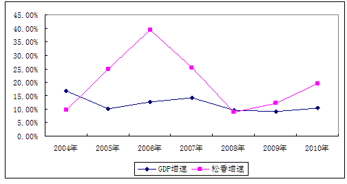 松香产业是林业相关产业的一种,与国家宏观经济周期相关性不大,松香作为拥有自主知识产权的产业在中国历经多年的发展,已成为不可忽视的产业力量,产业发展已驶入快车道。天竹纤维平均每年保持10%的增长,松香 行业 2009年遭遇了世界金融危机的巨大影响,松香增速迅速下降,受影响程度较大。
