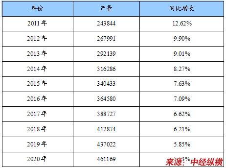 2011-2020年中国钼精矿折合量(折纯钼45%)产量预测表