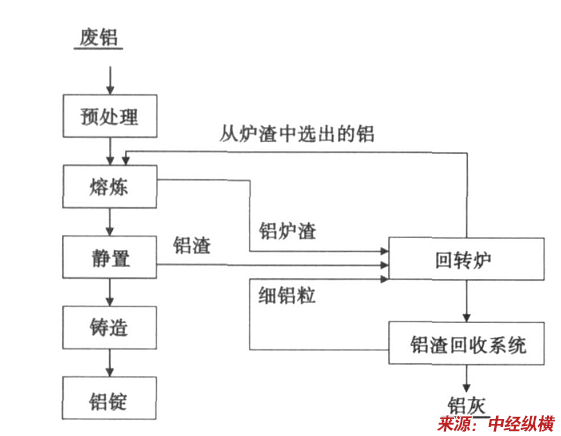 废铝品种繁多,成分各异, 通常不能用单一的方法处理。其中的主要生产工序为预处理、熔炼、合金调配与精炼四个环节。