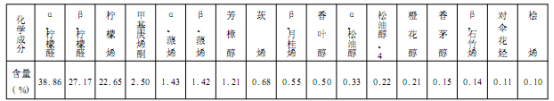 木姜子油主要存在于木姜子的果皮中,其量为鲜果重量的3%~5%。木姜子油的主要成分为柠檬醛,占60%~90%;其次为柠檬烯,占11%~18%;再次为甲基庚烯酮,占3%~7%。木姜子油中的柠檬醛含量与木姜子树的品种有关,脱毛木姜子精油含醛率达到90%,清香木姜子、毛叶木姜子的含醛率为80%多,尖叶木姜子只有60%多。