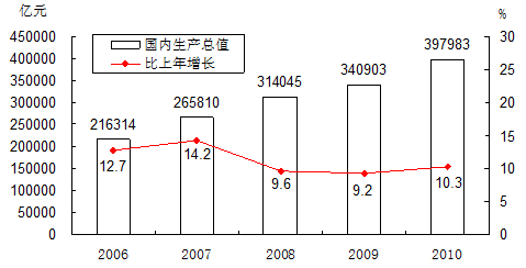 初步核算,全年国内生产总值[2]397983亿元,比上年增长10.3%。其中,第一产业增加值40497亿元,增长4.3%;第二产业增加值186481亿元,增长12.2%;第三产业增加值171005亿元,增长9.5%。第一产业增加值占国内生产总值的比重为10.2%,第二产业增加值比重为46.8%,第三产业增加值比重为43.0%。