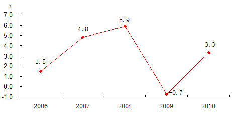 居民消费价格一季度同比上涨2.2%,二季度上涨2.9%,三季度上涨3.5%,四季度上涨4.7%,全年平均比上年上涨3.3%,其中食品价格上涨7.2%。固定资产投资价格上涨3.6%。工业品出厂价格上涨5.5%。原材料、燃料、动力购进价格上涨9.6%。农产品生产价格上涨10.9%。