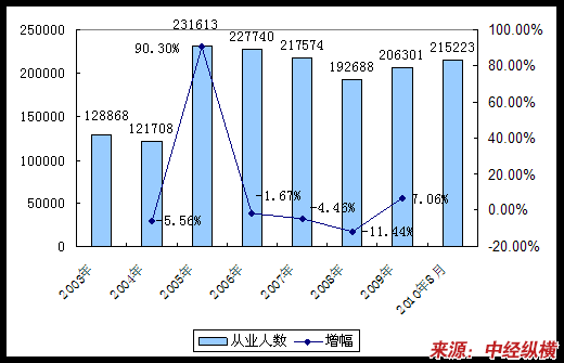 2003-2010年1-8月橡胶靴鞋制造 行业 从业人员增长情况