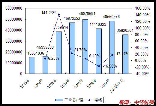2003-2010年1-8月橡胶靴鞋制造 行业 工业总产值增长情况