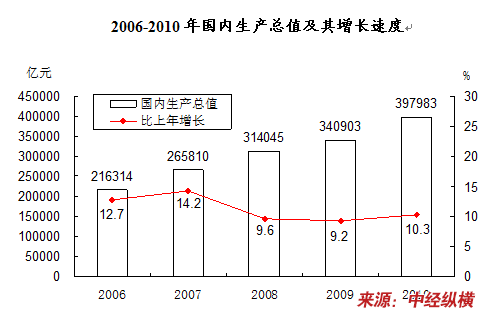 初步核算,2010全年中国国内生产总值[2]397983亿元,比上年增长10.3%。其中,第一产业增加值40497亿元,增长4.3%;第二产业增加值186481亿元,增长12.2%;第三产业增加值171005亿元,增长9.5%。第一产业增加值占国内生产总值的比重为10.2%,第二产业增加值比重为46.8%,第三产业增加值比重为43.0%。