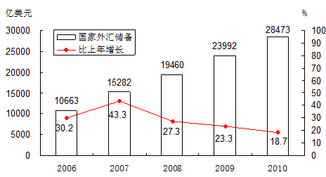 2006-2010年年末国家外汇储备及其增长速度