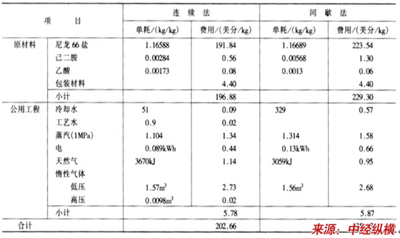 不同的尼龙66产品所采用的工艺各异,其带来的收益也不同,我国的尼龙66生产企业少,少数几家企业的收益较高。两种缩聚方法生产尼龙66树脂技术经济比较。